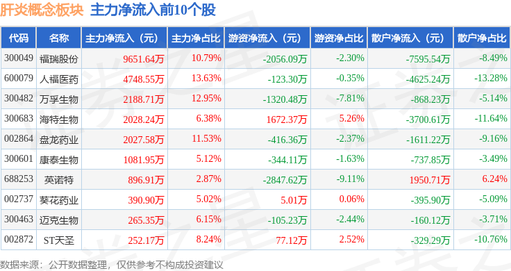 从资金流向上来看,当日肝炎概念板块主力资金净流出1.0亿元,游资资金净流入2899.83万元,散户资金净流入7148.46万元。肝炎概念板块个股资金流向见下表: