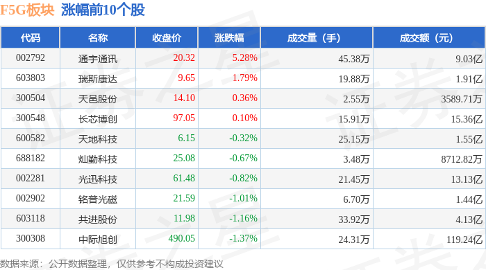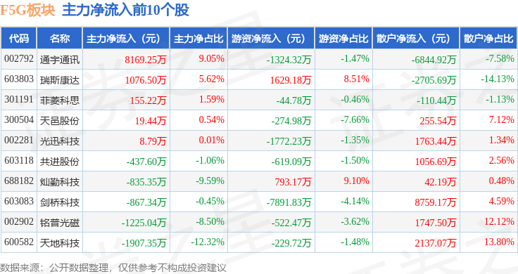 从资金流向上来看,当日F5G板块主力资金净流出9.04亿元,游资资金净流入4.46亿元,散户资金净流入4.57亿元。F5G板块个股资金流向见下表: