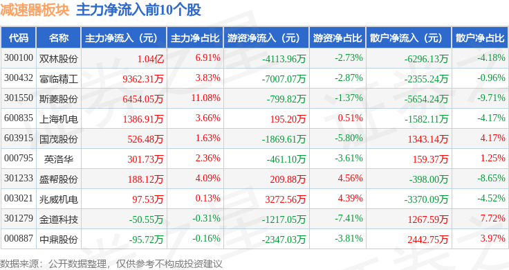从资金流向上来看,当日减速器板块主力资金净流出14.41亿元,游资资金净流入2.24亿元,散户资金净流入12.17亿元。减速器板块个股资金流向见下表: