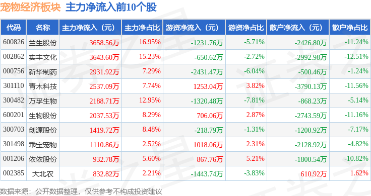 从资金流向上来看,当日宠物经济板块主力资金净流入4085.91万元,游资资金净流入3271.65万元,散户资金净流出7357.55万元。宠物经济板块个股资金流向见下表: