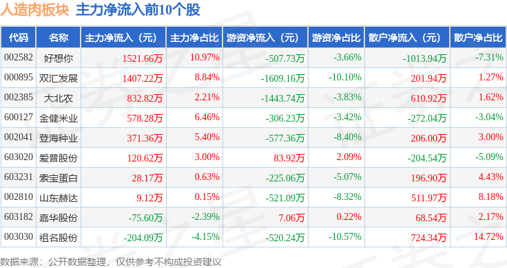 从资金流向上来看,当日人造肉板块主力资金净流出3.42亿元,游资资金净流出1.29亿元,散户资金净流入4.71亿元。人造肉板块个股资金流向见下表: