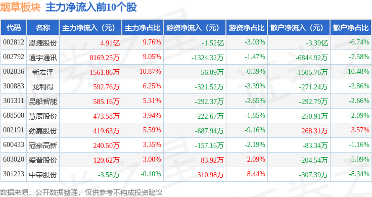 从资金流向上来看,当日烟草板块主力资金净流入4.38亿元,游资资金净流出1.32亿元,散户资金净流出3.06亿元。烟草板块个股资金流向见下表: