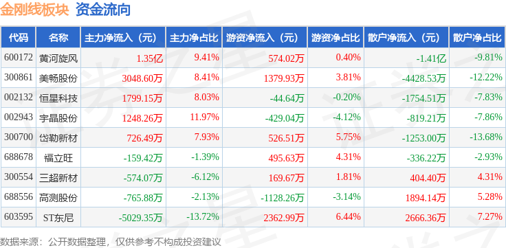 从资金流向上来看,当日金刚线板块主力资金净流入1.38亿元,游资资金净流入3906.82万元,散户资金净流出1.77亿元。金刚线板块个股资金流向见下表: