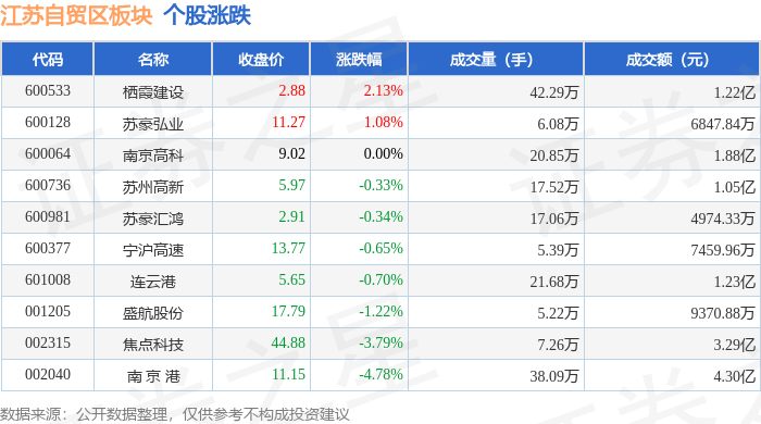 证券之星消息,11月7日江苏自贸区板块较上一交易日下跌0.9%,南 京 港领跌。当日上证指数报收于3997.56,下跌0.25%。深证成指报收于13404.06,下跌0.36%。江苏自贸区板块个股涨跌见下表: