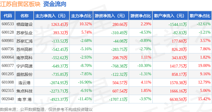 从资金流向上来看,当日江苏自贸区板块主力资金净流出1.02亿元,游资资金净流出1634.59万元,散户资金净流入1.19亿元。江苏自贸区板块个股资金流向见下表: