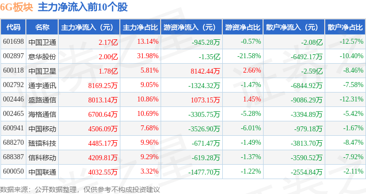 从资金流向上来看,当日6G板块主力资金净流出1.89亿元,游资资金净流入1.14亿元,散户资金净流入7477.65万元。6G板块个股资金流向见下表: