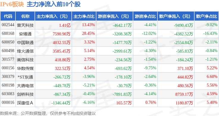 从资金流向上来看,当日IPv6板块主力资金净流出13.27亿元,游资资金净流入4.33亿元,散户资金净流入8.94亿元。IPv6板块个股资金流向见下表: