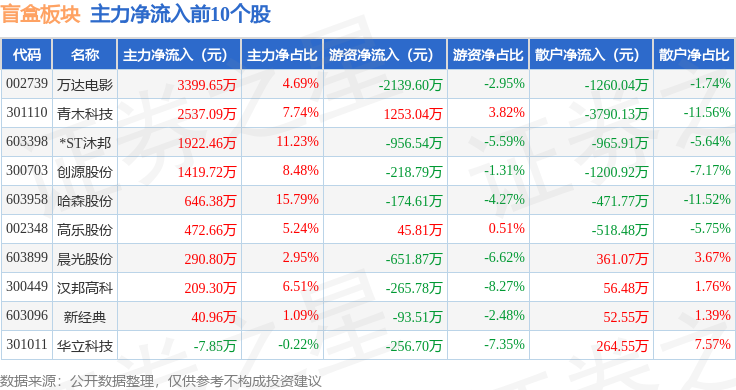 从资金流向上来看,当日盲盒板块主力资金净流出2.26亿元,游资资金净流入1.52亿元,散户资金净流入7387.29万元。盲盒板块个股资金流向见下表: