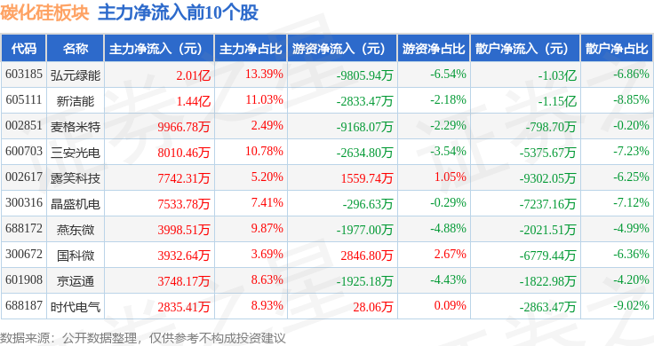 从资金流向上来看,当日碳化硅板块主力资金净流出3.41亿元,游资资金净流出3486.23万元,散户资金净流入3.76亿元。碳化硅板块个股资金流向见下表: