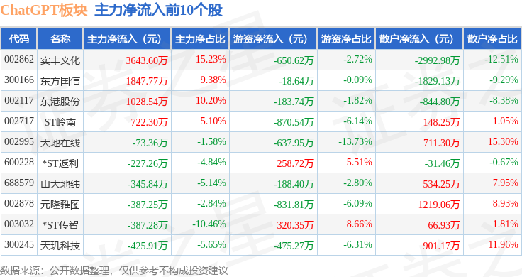 从资金流向上来看,当日ChatGPT板块主力资金净流出48.07亿元,游资资金净流入10.62亿元,散户资金净流入37.46亿元。ChatGPT板块个股资金流向见下表: