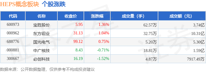 证券之星消息,11月7日HEPS概念板块较上一交易日上涨0.58%,宝胜股份领涨。当日上证指数报收于3997.56,下跌0.25%。深证成指报收于13404.06,下跌0.36%。HEPS概念板块个股涨跌见下表: