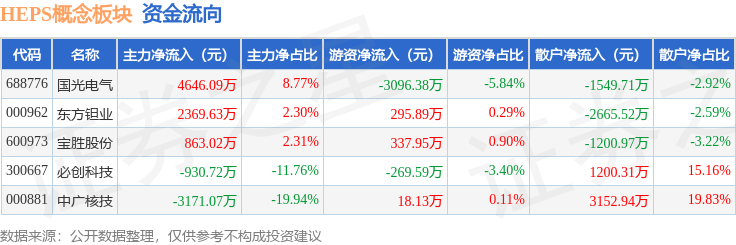 从资金流向上来看,当日HEPS概念板块主力资金净流入3776.94万元,游资资金净流出2714.0万元,散户资金净流出1062.94万元。HEPS概念板块个股资金流向见下表: