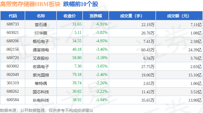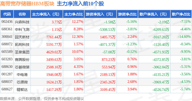 从资金流向上来看,当日高带宽存储器HBM板块主力资金净流出2.76亿元,游资资金净流入5008.99万元,散户资金净流入2.26亿元。高带宽存储器HBM板块个股资金流向见下表: