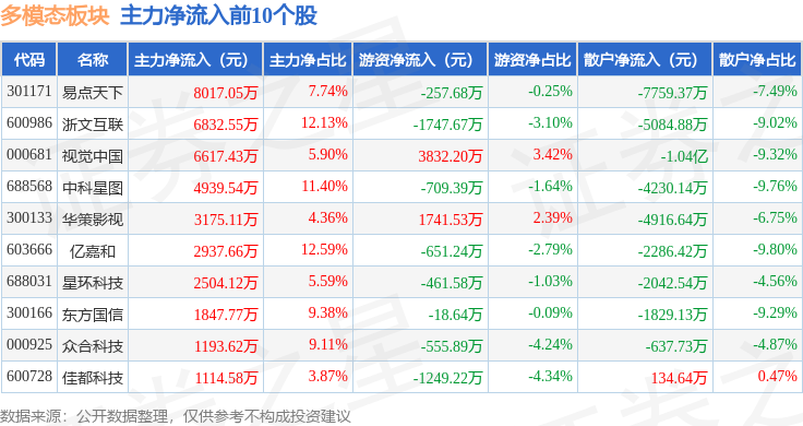 从资金流向上来看,当日多模态板块主力资金净流出41.3亿元,游资资金净流入10.2亿元,散户资金净流入31.1亿元。多模态板块个股资金流向见下表: