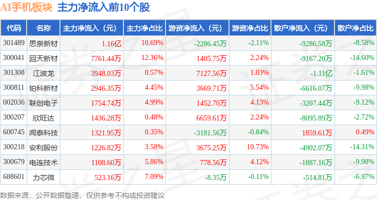 从资金流向上来看,当日AI手机板块主力资金净流出12.97亿元,游资资金净流入5.53亿元,散户资金净流入7.44亿元。AI手机板块个股资金流向见下表: