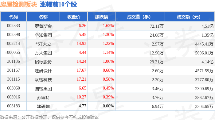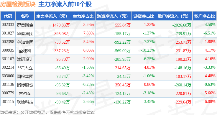 从资金流向上来看,当日房屋检测板块主力资金净流出5.43亿元,游资资金净流入4126.07万元,散户资金净流入5.02亿元。房屋检测板块个股资金流向见下表: