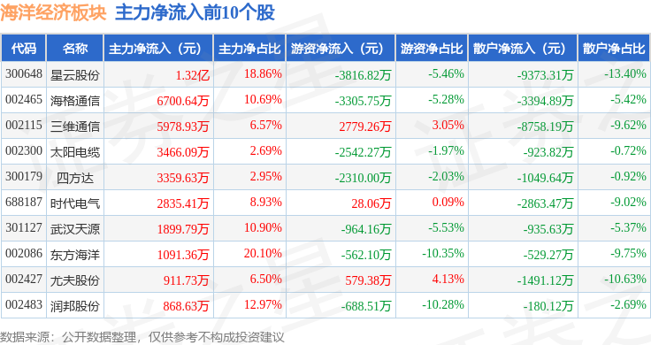 从资金流向上来看,当日海洋经济板块主力资金净流出9.1亿元,游资资金净流出1.12亿元,散户资金净流入10.22亿元。海洋经济板块个股资金流向见下表: