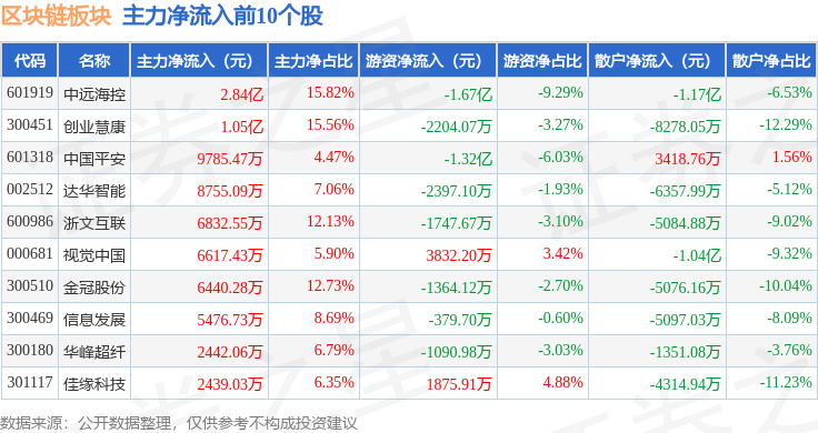 从资金流向上来看,当日区块链板块主力资金净流出84.13亿元,游资资金净流入13.59亿元,散户资金净流入70.53亿元。区块链板块个股资金流向见下表: