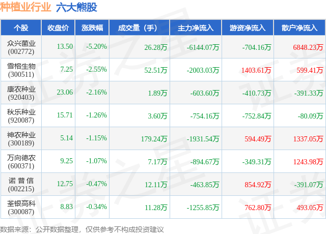个股表现方面,种植业行业当日领跌股为众兴菌业(002772),该股当日报收13.5,下跌5.2%,成交量26.28万,主力资金净流出6144.07万元。雪榕生物(300511)以下跌2.55%紧随其后,该股当日成交量52.51万,主力资金净流出2003.03万元。除此之外,康农种业(920403)、秋乐种业(920087)、神农种业(300189)均进入当日熊股之列。具体个股列表见下表:
