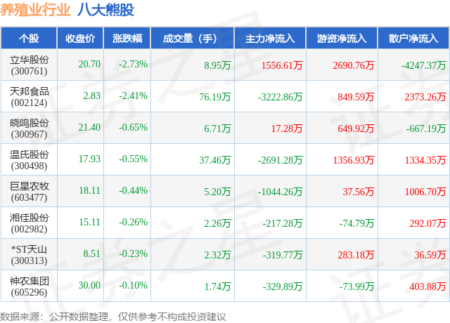 个股表现方面,养殖业行业当日领跌股为立华股份(300761),该股当日报收20.7,下跌2.73%,成交量8.95万,主力资金净流入1556.61万元。天邦食品(002124)以下跌2.41%紧随其后,该股当日成交量76.19万,主力资金净流出3222.86万元。除此之外,晓鸣股份(300967)、温氏股份(300498)、巨星农牧(603477)均进入当日熊股之列。具体个股列表见下表: