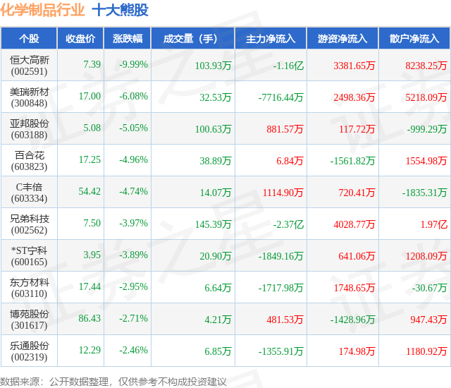 个股表现方面,化学制品行业当日领跌股为恒大高新(002591),该股当日报收7.39,下跌9.99%,成交量103.93万,主力资金净流出1.16亿元。美瑞新材(300848)以下跌6.08%紧随其后,该股当日成交量32.53万,主力资金净流出7716.44万元。除此之外,亚邦股份(603188)、百合花(603823)、C丰倍(603334)均进入当日熊股之列。具体个股列表见下表: