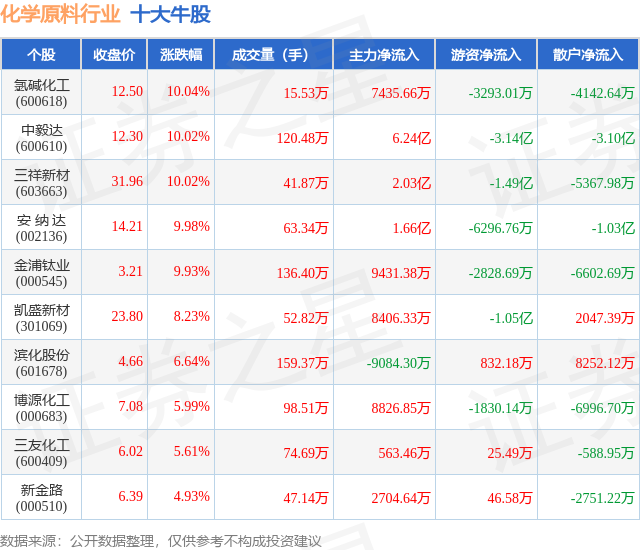 个股表现方面,化学原料行业当日领涨股为氯碱化工(600618),该股当日报收12.5,上涨10.04%,成交量15.53万,主力资金净流入7435.66万元。中毅达(600610)以上涨10.02%紧随其后,该股当日成交量120.48万,主力资金净流入6.24亿元。除此之外,三祥新材(603663)、安 纳 达(002136)、金浦钛业(000545)均进入当日牛股之列。具体个股列表见下表: