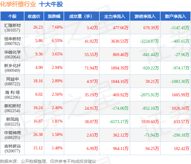 个股表现方面,化学纤维行业当日领涨股为汇隆新材(301057),该股当日报收26.23,上涨7.68%,成交量3.42万,主力资金净流入477.06万元。恒申新材(000782)以上涨6.55%紧随其后,该股当日成交量41.02万,主力资金净流入3630.53万元。除此之外,华峰化学(002064)、新乡化纤(000949)、同益中(688722)均进入当日牛股之列。具体个股列表见下表: