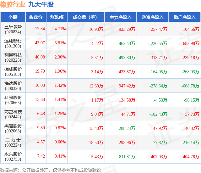 个股表现方面,橡胶行业当日领涨股为三维装备(920834),该股当日报收17.34,上涨4.71%,成交量10.93万,主力资金净流入923.29万元。远翔新材(301300)以上涨3.81%紧随其后,该股当日成交量4.22万,主力资金净流出462.43万元。除此之外,利通科技(920225)、确成股份(605183)、海达股份(300320)均进入当日牛股之列。具体个股列表见下表: