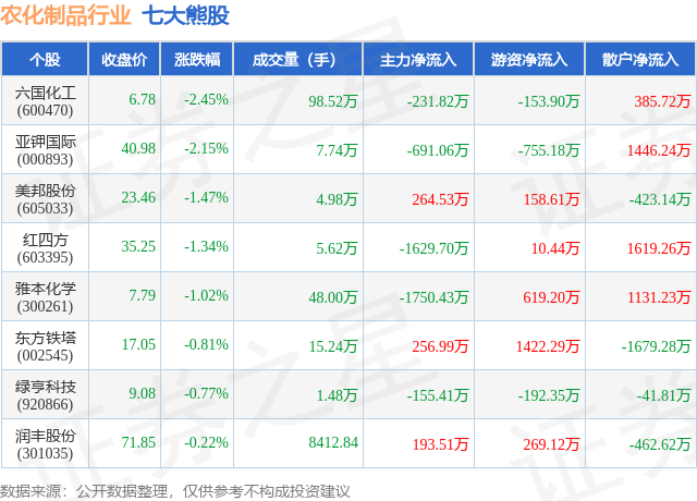 个股表现方面,农化制品行业当日领跌股为六国化工(600470),该股当日报收6.78,下跌2.45%,成交量98.52万,主力资金净流出231.82万元。亚钾国际(000893)以下跌2.15%紧随其后,该股当日成交量7.74万,主力资金净流出691.06万元。除此之外,美邦股份(605033)、红四方(603395)、雅本化学(300261)均进入当日熊股之列。具体个股列表见下表: