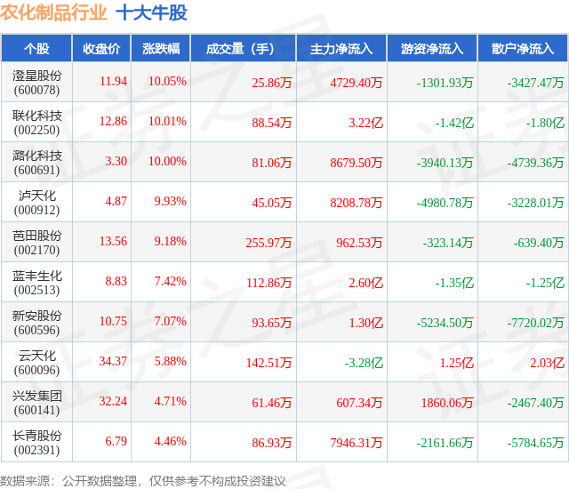 个股表现方面,农化制品行业当日领涨股为澄星股份(600078),该股当日报收11.94,上涨10.05%,成交量25.86万,主力资金净流入4729.4万元。联化科技(002250)以上涨10.01%紧随其后,该股当日成交量88.54万,主力资金净流入3.22亿元。除此之外,潞化科技(600691)、泸天化(000912)、芭田股份(002170)均进入当日牛股之列。具体个股列表见下表: