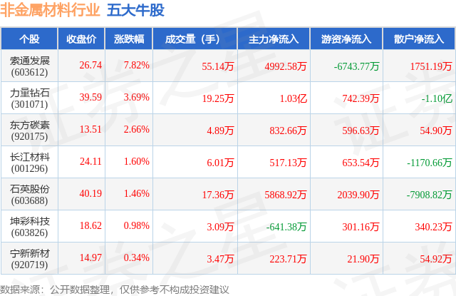 个股表现方面,非金属材料行业当日领涨股为索通发展(603612),该股当日报收26.74,上涨7.82%,成交量55.14万,主力资金净流入4992.58万元。力量钻石(301071)以上涨3.69%紧随其后,该股当日成交量19.25万,主力资金净流入1.03亿元。除此之外,东方碳素(920175)、长江材料(001296)、石英股份(603688)均进入当日牛股之列。具体个股列表见下表: