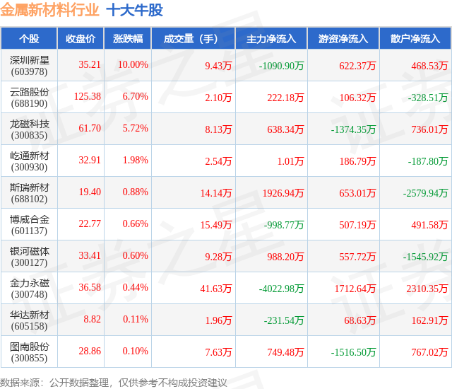 个股表现方面,金属新材料行业当日领涨股为深圳新星(603978),该股当日报收35.21,上涨10.0%,成交量9.43万,主力资金净流出1090.9万元。云路股份(688190)以上涨6.7%紧随其后,该股当日成交量2.1万,主力资金净流入222.18万元。除此之外,龙磁科技(300835)、屹通新材(300930)、斯瑞新材(688102)均进入当日牛股之列。具体个股列表见下表: