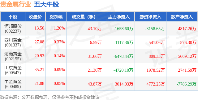 个股表现方面,贵金属行业当日领涨股为恒邦股份(002237),该股当日报收13.5,上涨1.2%,成交量43.1万,主力资金净流出1658.6万元。四川黄金(001337)以上涨0.37%紧随其后,该股当日成交量6.59万,主力资金净流出1117.36万元。除此之外,湖南黄金(002155)、山东黄金(600547)、中金黄金(600489)均进入当日牛股之列。具体个股列表见下表: