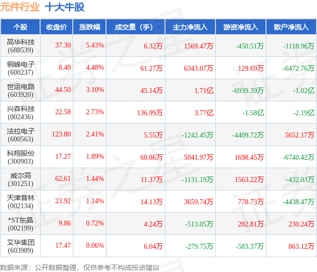 个股表现方面,元件行业当日领涨股为高华科技(688539),该股当日报收37.3,上涨5.43%,成交量6.32万,主力资金净流入1569.47万元。铜峰电子(600237)以上涨4.48%紧随其后,该股当日成交量61.27万,主力资金净流入6343.07万元。除此之外,世运电路(603920)、兴森科技(002436)、法拉电子(600563)均进入当日牛股之列。具体个股列表见下表: