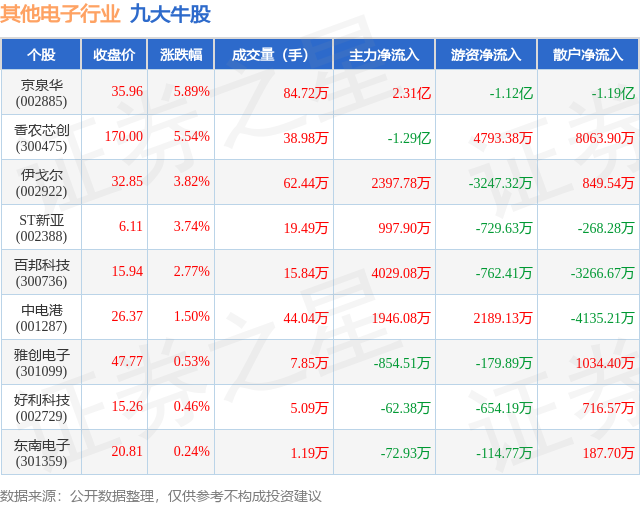 个股表现方面,其他电子行业当日领涨股为京泉华(002885),该股当日报收35.96,上涨5.89%,成交量84.72万,主力资金净流入2.31亿元。香农芯创(300475)以上涨5.54%紧随其后,该股当日成交量38.98万,主力资金净流出1.29亿元。除此之外,伊戈尔(002922)、ST新亚(002388)、百邦科技(300736)均进入当日牛股之列。具体个股列表见下表: