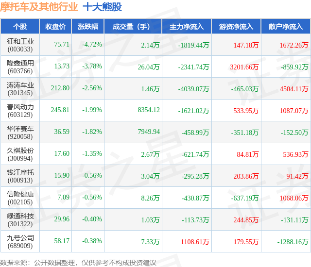 个股表现方面,摩托车及其他行业当日领跌股为征和工业(003033),该股当日报收75.71,下跌4.72%,成交量2.14万,主力资金净流出1819.44万元。隆鑫通用(603766)以下跌3.78%紧随其后,该股当日成交量26.04万,主力资金净流出2341.74万元。除此之外,涛涛车业(301345)、春风动力(603129)、华洋赛车(920058)均进入当日熊股之列。具体个股列表见下表: