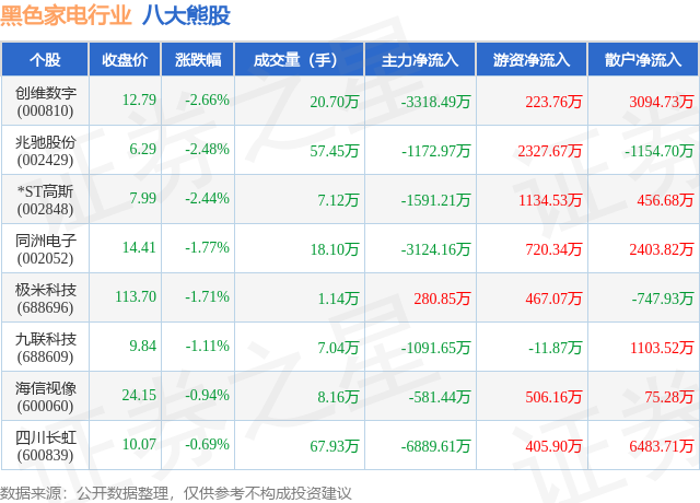个股表现方面,黑色家电行业当日领跌股为创维数字(000810),该股当日报收12.79,下跌2.66%,成交量20.7万,主力资金净流出3318.49万元。兆驰股份(002429)以下跌2.48%紧随其后,该股当日成交量57.45万,主力资金净流出1172.97万元。除此之外,*ST高斯(002848)、同洲电子(002052)、极米科技(688696)均进入当日熊股之列。具体个股列表见下表: