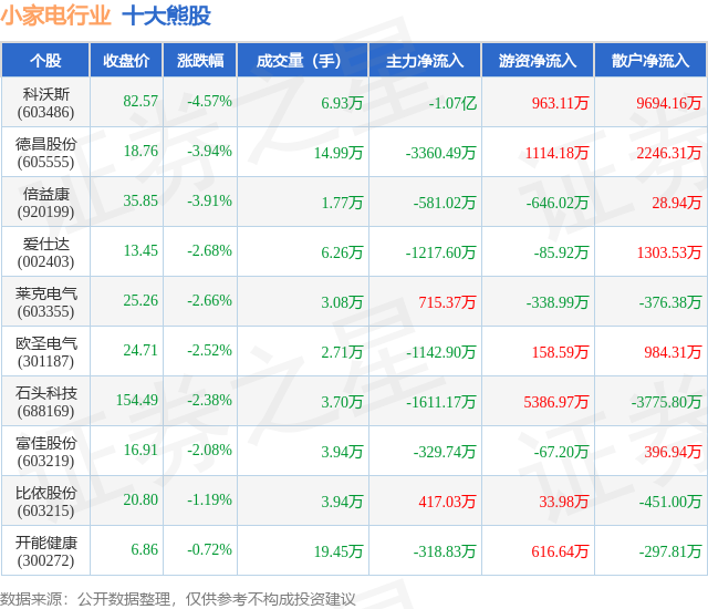 个股表现方面,小家电行业当日领跌股为科沃斯(603486),该股当日报收82.57,下跌4.57%,成交量6.93万,主力资金净流出1.07亿元。德昌股份(605555)以下跌3.94%紧随其后,该股当日成交量14.99万,主力资金净流出3360.49万元。除此之外,倍益康(920199)、爱仕达(002403)、莱克电气(603355)均进入当日熊股之列。具体个股列表见下表: