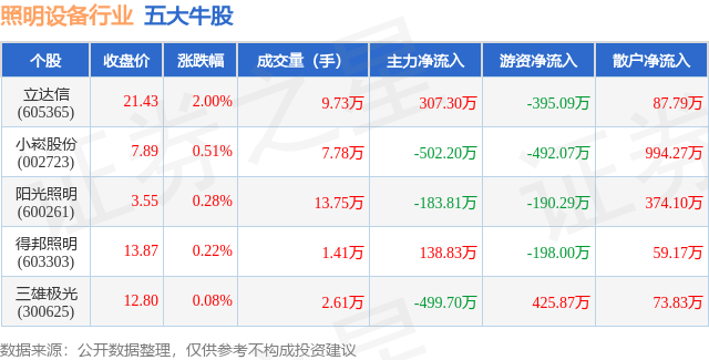 个股表现方面,照明设备行业当日领涨股为立达信(605365),该股当日报收21.43,上涨2.0%,成交量9.73万,主力资金净流入307.3万元。小崧股份(002723)以上涨0.51%紧随其后,该股当日成交量7.78万,主力资金净流出502.2万元。除此之外,阳光照明(600261)、得邦照明(603303)、三雄极光(300625)均进入当日牛股之列。具体个股列表见下表: