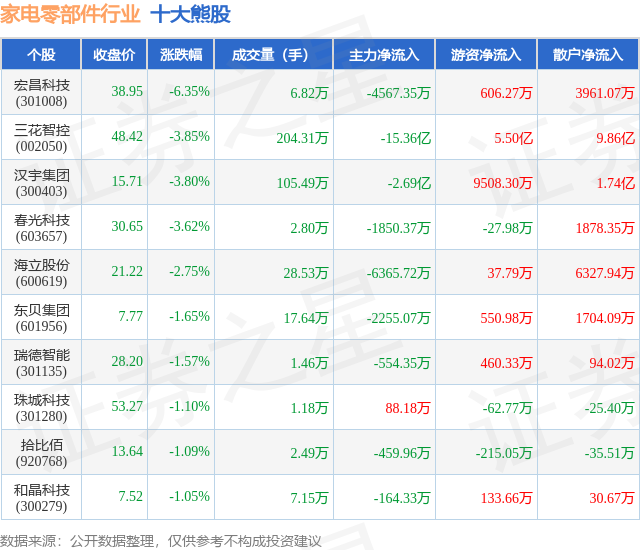个股表现方面,家电零部件行业当日领跌股为宏昌科技(301008),该股当日报收38.95,下跌6.35%,成交量6.82万,主力资金净流出4567.35万元。三花智控(002050)以下跌3.85%紧随其后,该股当日成交量204.31万,主力资金净流出15.36亿元。除此之外,汉宇集团(300403)、春光科技(603657)、海立股份(600619)均进入当日熊股之列。具体个股列表见下表: