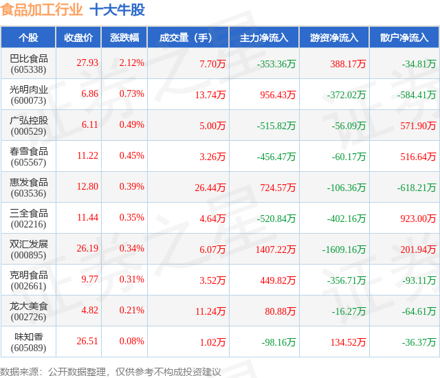 个股表现方面,食品加工行业当日领涨股为巴比食品(605338),该股当日报收27.93,上涨2.12%,成交量7.7万,主力资金净流出353.36万元。光明肉业(600073)以上涨0.73%紧随其后,该股当日成交量13.74万,主力资金净流入956.43万元。除此之外,广弘控股(000529)、春雪食品(605567)、惠发食品(603536)均进入当日牛股之列。具体个股列表见下表: