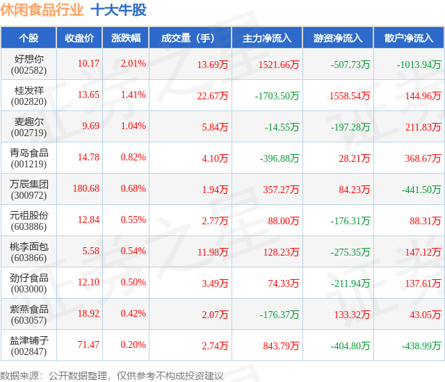 个股表现方面,休闲食品行业当日领涨股为好想你(002582),该股当日报收10.17,上涨2.01%,成交量13.69万,主力资金净流入1521.66万元。桂发祥(002820)以上涨1.41%紧随其后,该股当日成交量22.67万,主力资金净流出1703.5万元。除此之外,麦趣尔(002719)、青岛食品(001219)、万辰集团(300972)均进入当日牛股之列。具体个股列表见下表: