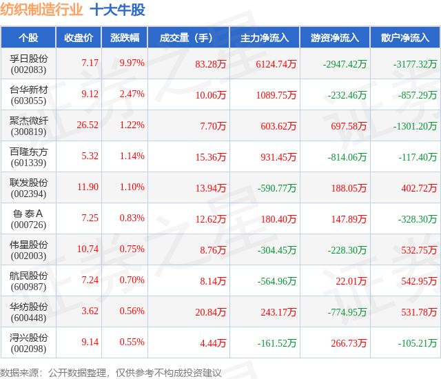 个股表现方面,纺织制造行业当日领涨股为孚日股份(002083),该股当日报收7.17,上涨9.97%,成交量83.28万,主力资金净流入6124.74万元。台华新材(603055)以上涨2.47%紧随其后,该股当日成交量10.06万,主力资金净流入1089.75万元。除此之外,聚杰微纤(300819)、百隆东方(601339)、联发股份(002394)均进入当日牛股之列。具体个股列表见下表: