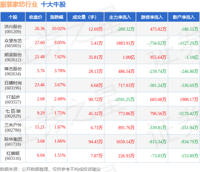 个股表现方面,服装家纺行业当日领涨股为洪兴股份(001209),该股当日报收26.36,上涨10.02%,成交量12.69万,主力资金净流出289.32万元。众望布艺(605003)以上涨9.05%紧随其后,该股当日成交量5.41万,主力资金净流入1883.91万元。除此之外,朗姿股份(002612)、棒杰股份(002634)、日播时尚(603196)均进入当日牛股之列。具体个股列表见下表: