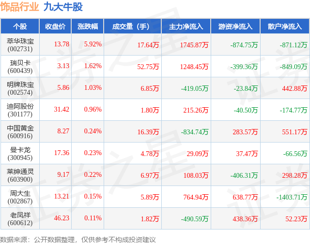 个股表现方面,饰品行业当日领涨股为萃华珠宝(002731),该股当日报收13.78,上涨5.92%,成交量17.64万,主力资金净流入1745.87万元。瑞贝卡(600439)以上涨1.62%紧随其后,该股当日成交量52.75万,主力资金净流入1248.45万元。除此之外,明牌珠宝(002574)、迪阿股份(301177)、中国黄金(600916)均进入当日牛股之列。具体个股列表见下表: