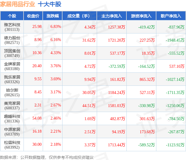 个股表现方面,家居用品行业当日领涨股为雅艺科技(301113),该股当日报收25.98,上涨6.83%,成交量4.34万,主力资金净流入1257.38万元。德力股份(002571)以上涨6.16%紧随其后,该股当日成交量31.62万,主力资金净流入1721.2万元。除此之外,顶固集创(300749)、金牌家居(603180)、我乐家居(603326)均进入当日牛股之列。具体个股列表见下表: