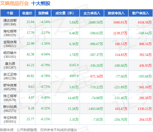 个股表现方面,文娱用品行业当日领跌股为通达创智(001368),该股当日报收25.84,下跌4.54%,成交量5.84万,主力资金净流出2680.58万元。海伦钢琴(300329)以下跌3.17%紧随其后,该股当日成交量6.4万,主力资金净流出590.63万元。除此之外,金陵体育(300651)、明月镜片(301101)、康力源(301287)均进入当日熊股之列。具体个股列表见下表:
