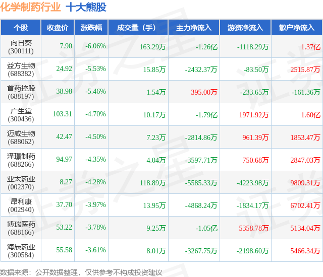 个股表现方面,化学制药行业当日领跌股为向日葵(300111),该股当日报收7.9,下跌6.06%,成交量163.29万,主力资金净流出1.26亿元。益方生物(688382)以下跌5.53%紧随其后,该股当日成交量15.85万,主力资金净流出2432.37万元。除此之外,首药控股(688197)、广生堂(300436)、迈威生物(688062)均进入当日熊股之列。具体个股列表见下表: