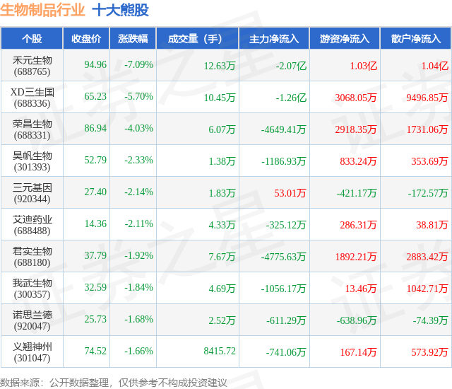 个股表现方面,生物制品行业当日领跌股为禾元生物(688765),该股当日报收94.96,下跌7.09%,成交量12.63万,主力资金净流出2.07亿元。XD三生国(688336)以下跌5.7%紧随其后,该股当日成交量10.45万,主力资金净流出1.26亿元。除此之外,荣昌生物(688331)、昊帆生物(301393)、三元基因(920344)均进入当日熊股之列。具体个股列表见下表: