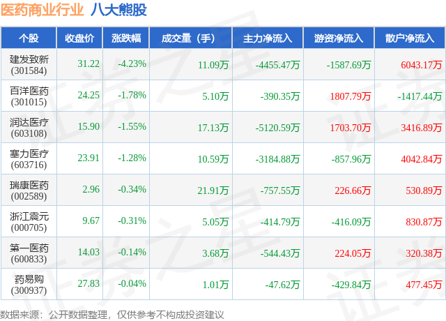 个股表现方面,医药商业行业当日领跌股为建发致新(301584),该股当日报收31.22,下跌4.23%,成交量11.09万,主力资金净流出4455.47万元。百洋医药(301015)以下跌1.78%紧随其后,该股当日成交量5.1万,主力资金净流出390.35万元。除此之外,润达医疗(603108)、塞力医疗(603716)、瑞康医药(002589)均进入当日熊股之列。具体个股列表见下表: